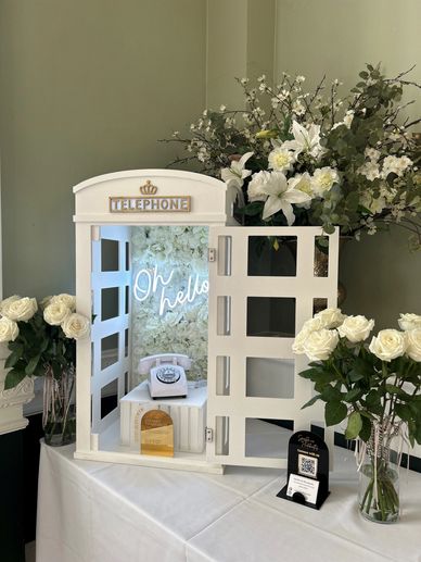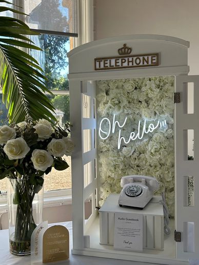 Our stunning Audio Guest Book, decorated with romantic white flowers and stand out neon sign. A unique twist on the traditional guest. Your guest pick up the phone to hear your pre-recorded message as the new Mr & Mrs, your guests then leave a message of well wishes, advice for married life, stories down memory lane, a sing song - anything goes! You will then be sent a link for all your voice messages from your guests to download.